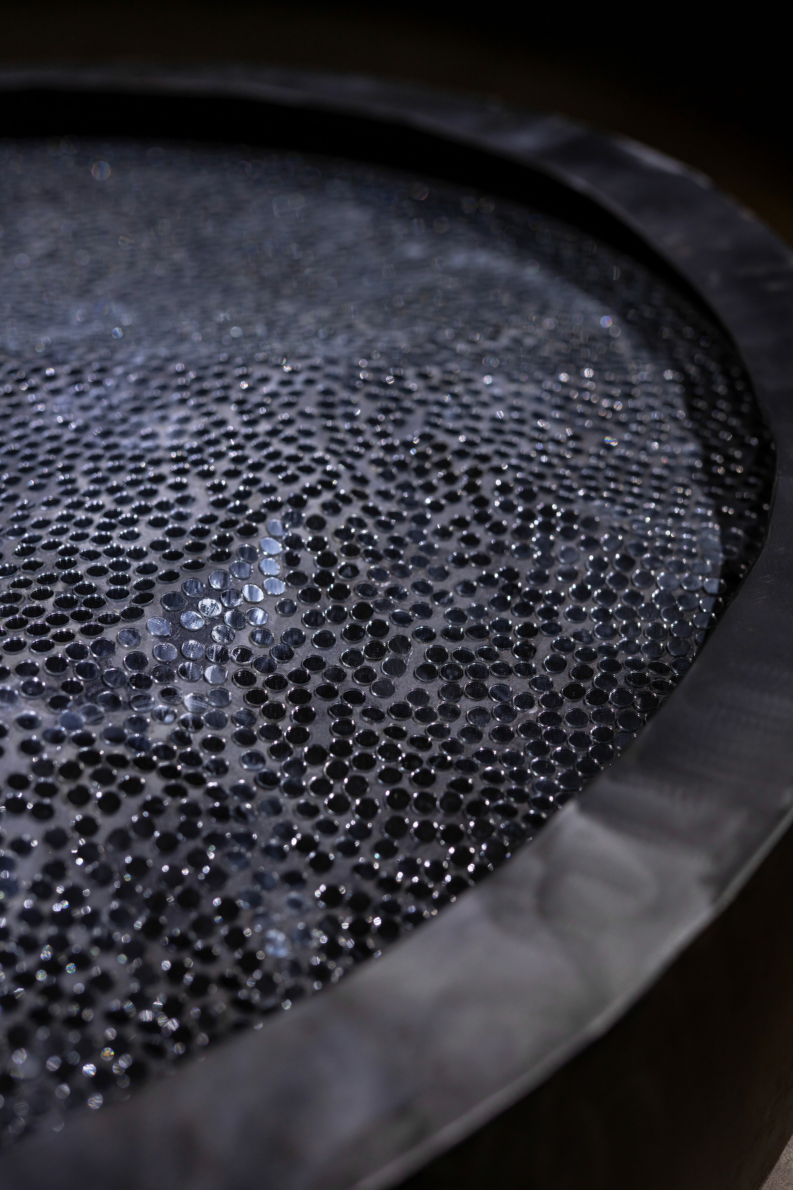 On the first floor of Villa, another work by Zoro hangs in front of the window, Fluid Fingers. The sculpture begins with something simple: the movement of air and liquid. It’s a subtle, rectangular piece made of two thin plates of tempered, reinforced glass, pressed tightly together with a viscous fluid in between. As the plates shift against each other, the air moves too, shaping the liquid into ever-changing forms. Light from the window filters through, turning the piece into something almost meditative. You understand what’s happening, yet you keep watching. This work needs little explanation because it comes directly from the world. And at the same time, the question arises: how does it work? “It’s remarkable that people ask, because when they see a waterfall, no one wonders how it works.”