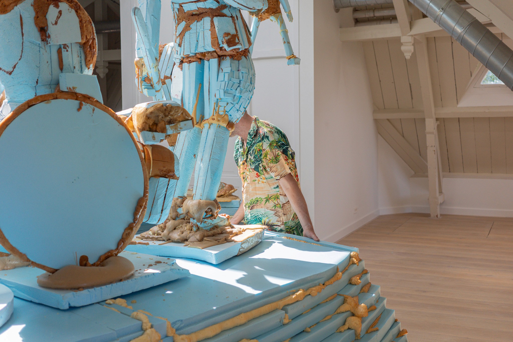 Folkert de Jong (1972) staat bekend om zijn levensgrote sculpturen, waarin geschiedenis en heden samensmelten. Zijn figuren zijn vaak geïnspireerd op historische gebeurtenissen, die hij door een hedendaagse lens opnieuw interpreteert om thema's als identiteit, moraliteit en maatschappelijke structuren te verkennen. Gefascineerd door de donkere kanten van de menselijke psyche, creëert hij groteske werelden die macht, geweld en menselijke ambitie verkennen in zijn kenmerkende schuim. Folkert hanteert zowel een sculpturale als een schilderachtige benadering, die zich heeft ontwikkeld van vroege monochrome werken naar gelaagde composities. Zijn theatrale scènes nodigen de toeschouwer uit om fysiek en emotioneel betrokken te raken. Folkert ontving in 2003 de Prix de Rome voor beeldhouwkunst. Zijn werk is internationaal tentoongesteld, onder meer in New York, Los Angeles, Sydney, Londen, Athene en Gent. Hij woont in Amsterdam en heeft zijn atelier in Almere Buiten.
