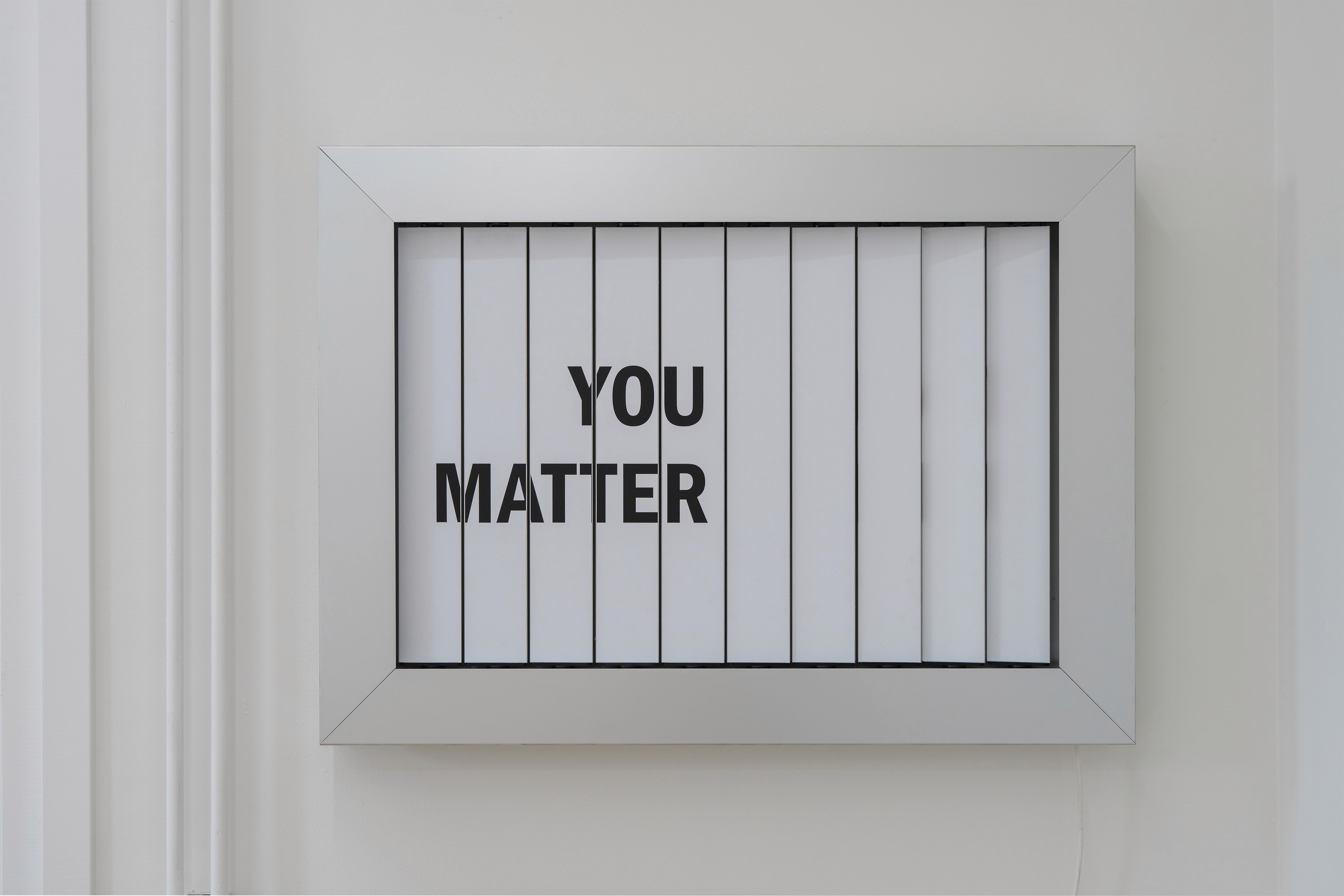 In dezelfde ruimte hangt een ander werk van Max aan de muur met als titel You Matter Don’t Give Up uit 2023: een ophangbord met woorden die geleidelijk veranderen door paneeltjes die zicht omdraaien. Het bord begint met You Matter, verandert in Don’t give up en eindigt uiteindelijk in de volledige zin: You Don’t Matter Give Up. Zo ontstaan er twee totaal verschillende betekenissen. Aanvankelijk lijkt het bord de toeschouwer moed in te spreken: je doet ertoe, geef niet op. Maar bij het doorlezen keert die boodschap om: je doet er niet toe, geef het maar op. Een minimale verandering in tekst, met een radicaal andere lading.