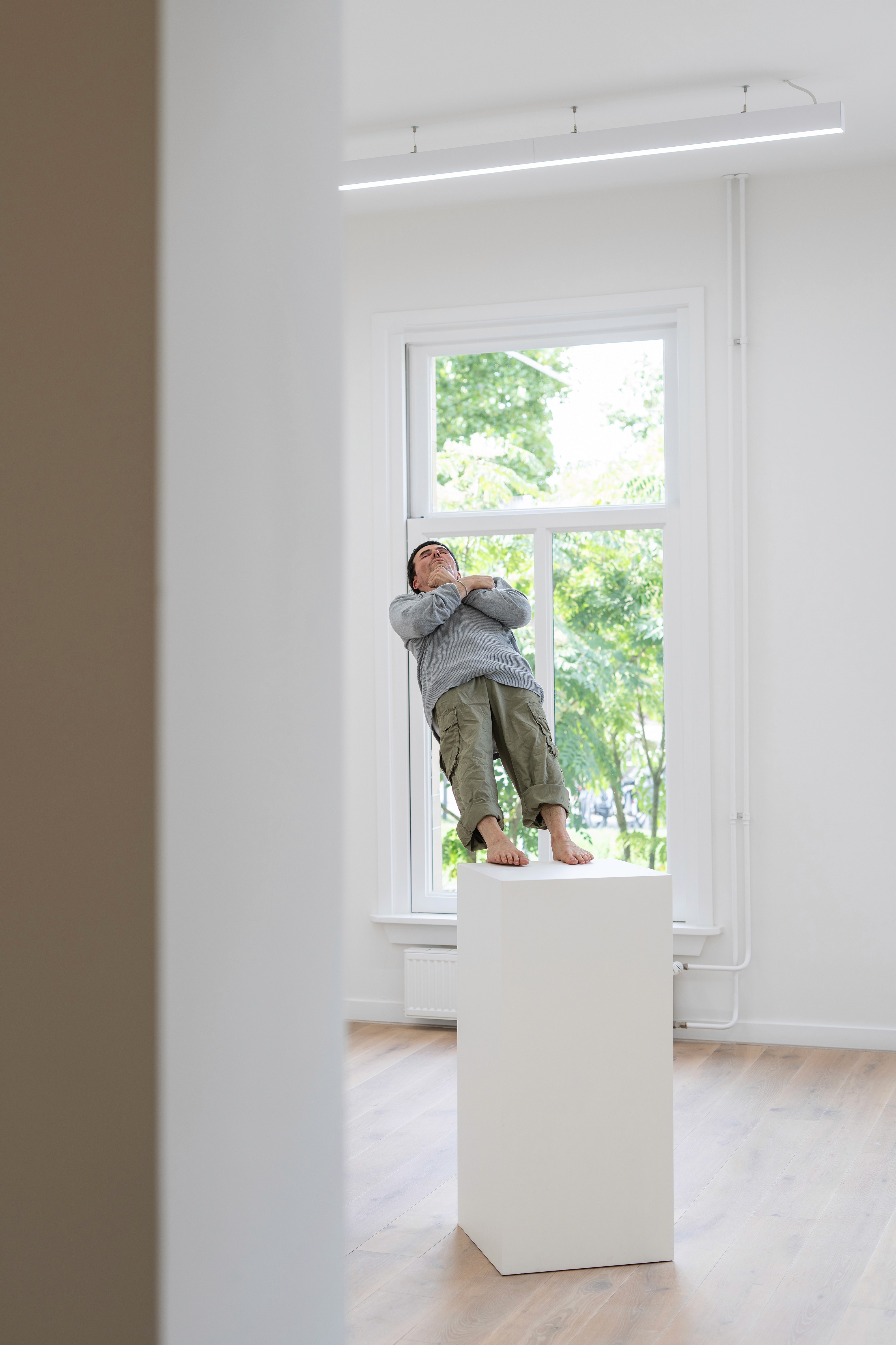 Max past bij het bord dezelfde strategie toe als bij zijn sculptuur op de sokkel. Met subtiele ingrepen, een vallende sculptuur balancerend op een witte rand, of het samenvoegen van twee zinnen, daagt hij ons uit om anders naar de werkelijkheid te kijken. Het bord laat ook de betekenis van de sculptuur veranderen. Want waarom laat de man zich van de sokkel vallen? Heeft hij inderdaad het vertrouwen om opgevangen te worden, of wil Max met deze beeldencombinatie iets anders laten zien? Een gevoel van gelatenheid, van iemand die de handdoek in de ring gooit?