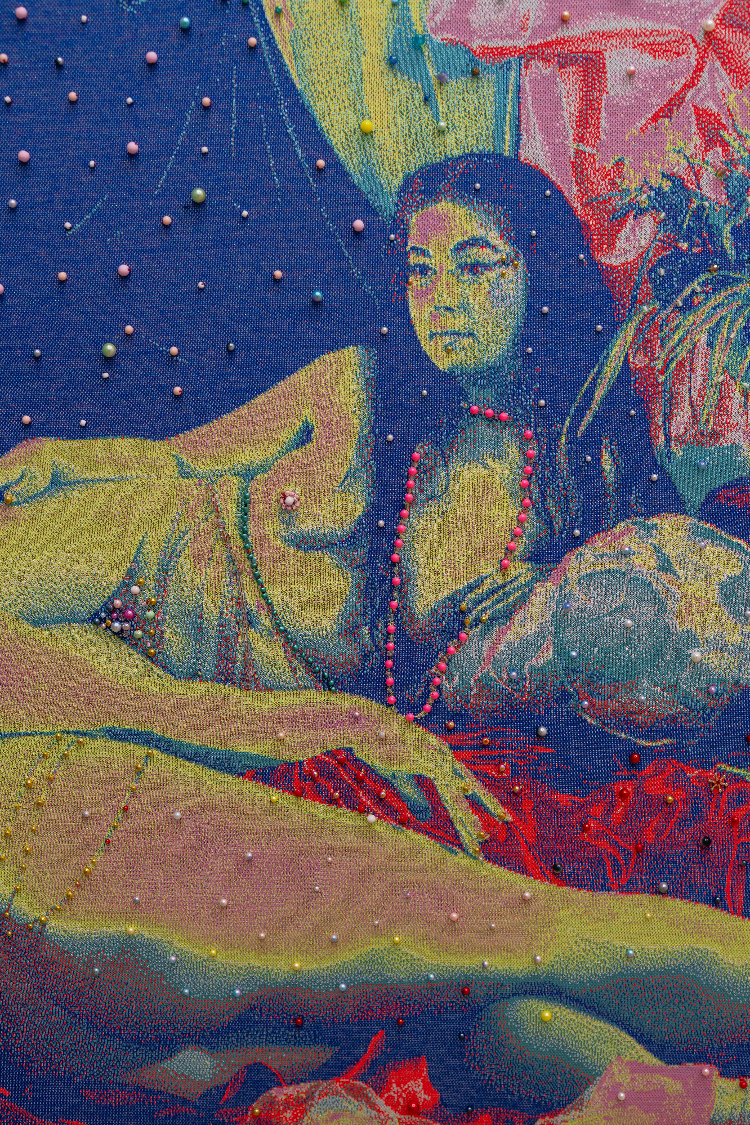 De andere drie werken in de ruimte van Yamuna zien eruit als schilderijen, maar zijn gemaakt van textiel. Met deze werken wil ze renaissanceschilderijen hercreëren door een queer lens, om zo haar gemeenschap op een voetstuk te plaatsen.