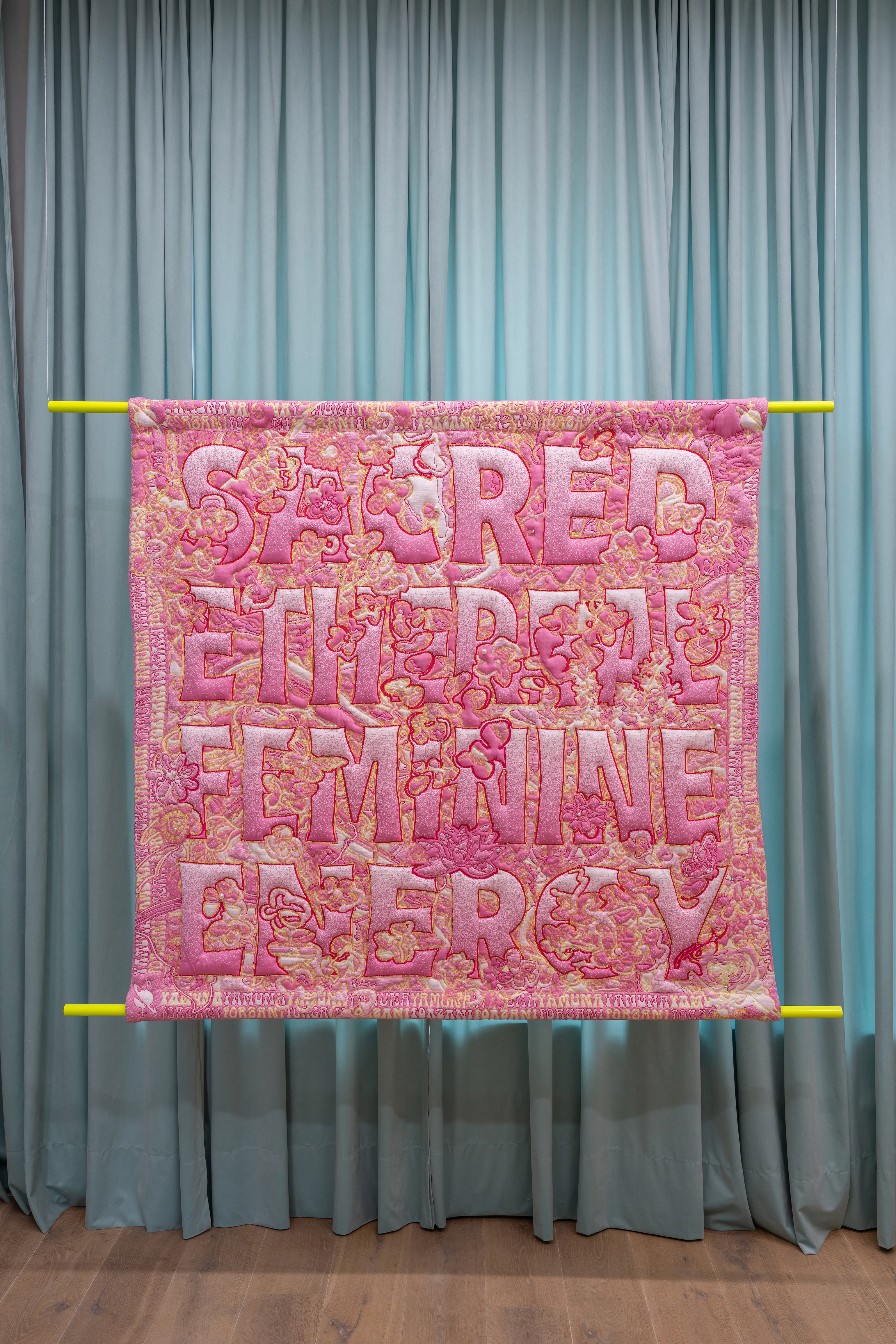 Voor een lichtblauw gordijn op de begane grond hangt een roze wandkleed. Yamuna maakte het samen met typografisch ontwerper Céline Hurka. Het kleed is bewerkt met een quilttechniek, en uit het opbollende 3D-textiel verschijnt de tekst Sacred Ethereal Feminine Energy. Een kleed dat dus heilige en vrouwelijke energie viert. De letters lijken deels overwoekerd te zijn door bloemen. De bloem dus als symbool voor deze energie. Het kunstwerk is gemaakt in 2023 en was de start van de samenwerking tussen Yamuna en Céline. Samen doken ze in archieven en museumcollecties, waaronder die van het Amsterdam Museum, en gingen op zoek naar werken en symboliek van vrouwelijke makers. Dit onderzoek leidde hen naar historische objecten zoals merklappen en vaandels, die ze als inspiratiebron gebruikten voor nieuwe, inclusieve lettertypen.