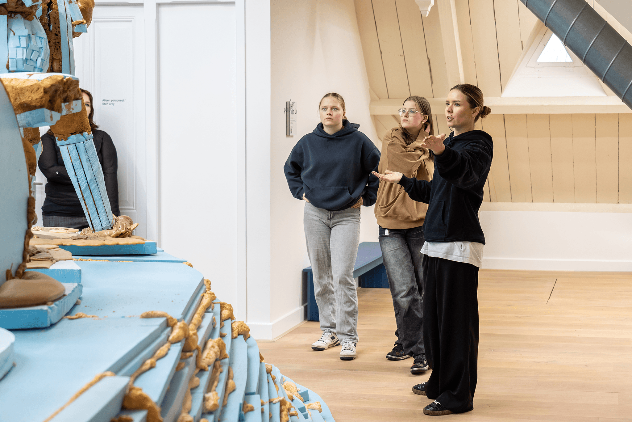 Onze museummedewerkers leiden u rond in het gebouw en geven u inzicht in onze samenwerkingen met kunstenaars en de verhalen achter hun werk. Ze moedigen u aan om goed te kijken, geven u informatie en stellen u vragen. Na de rondleiding kunt u op eigen gelegenheid verder verkennen.
