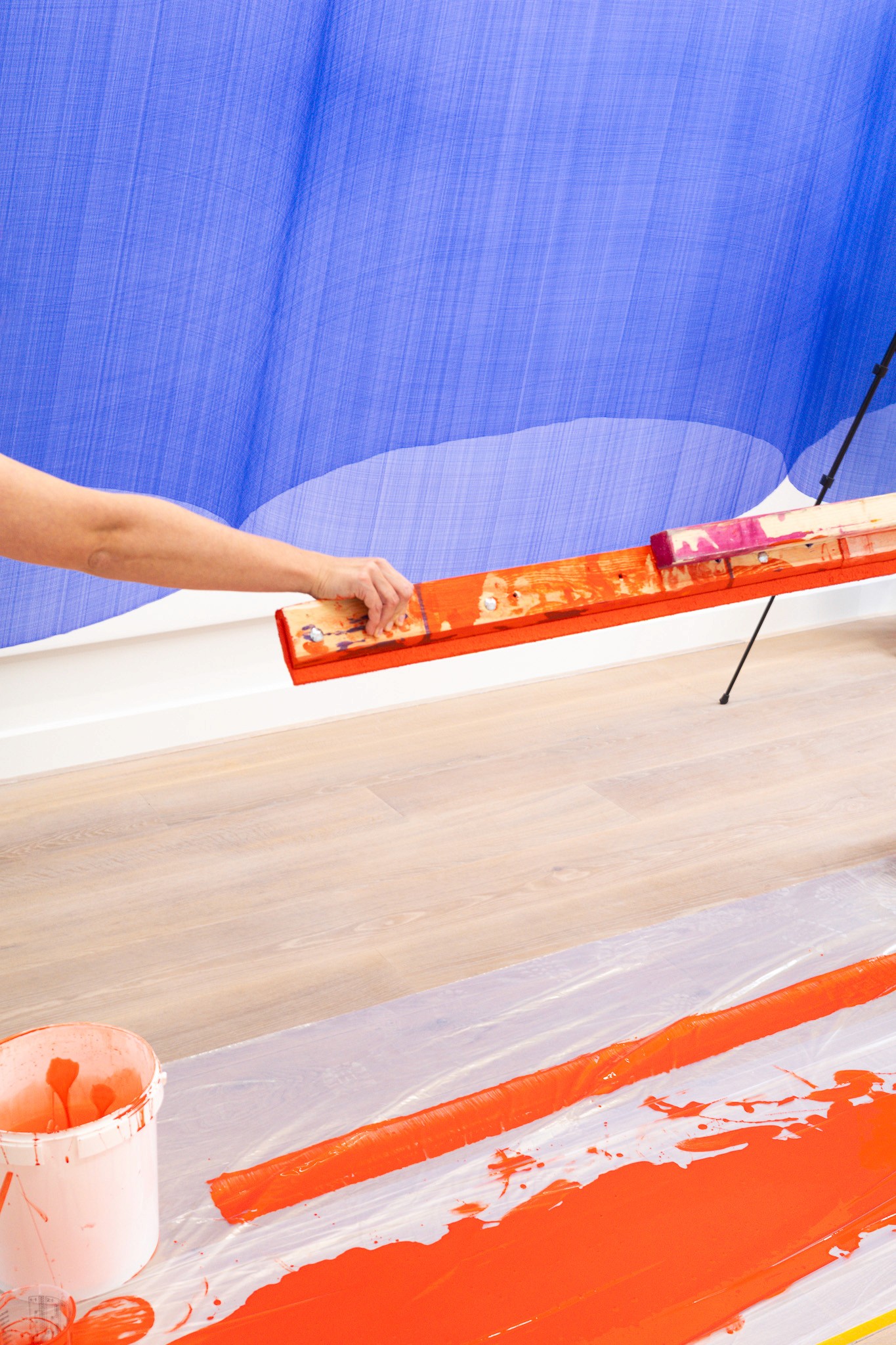 Naast de rode cilinder op de muur met de titel Two Red Parallel Lines laat hij op canvas Two Blue Parallel Lines zien. De marker beweegt hier parallel aan de zijden van het doek, deze schuine, cursieve beweging blijft nagalmen in de vorm. Het werk lijkt zich schuin te verhouden tot de architectuur van de ruimte, waardoor je gedesoriënteerd achterblijft.