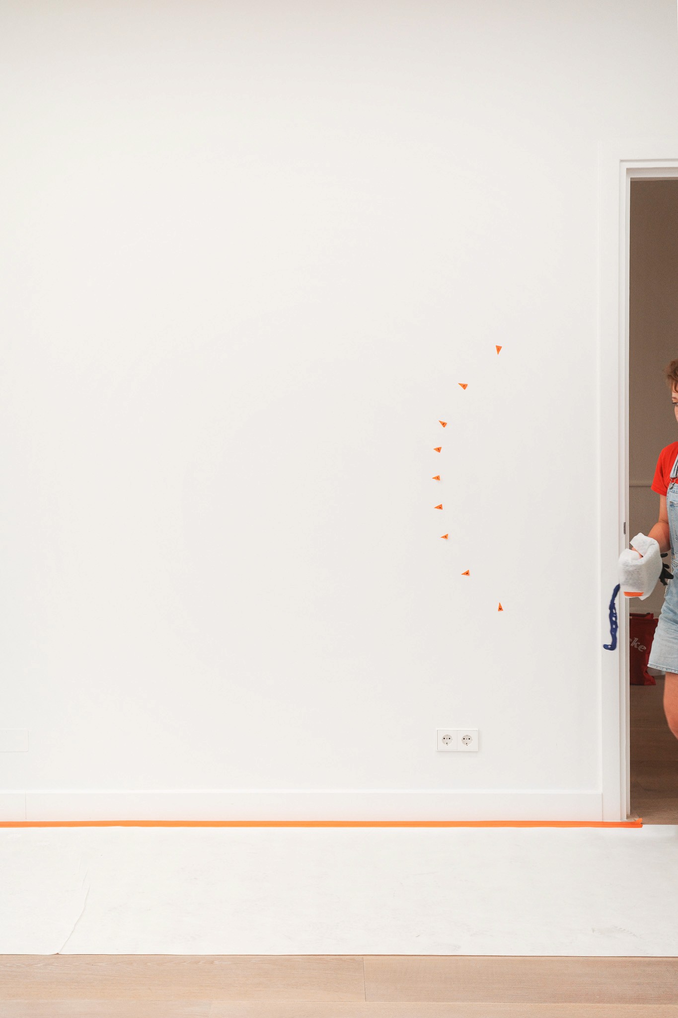 Als je goed kijkt naar de rode muurschildering, snap je er tegelijkertijd helemaal niks van. Hoe heeft hij die lijnen in één keer op de muur gekregen? Hoe kan de muurschildering zo groot zijn zonder hapering of vlekken? Heeft hij dit met de hand geschilderd?