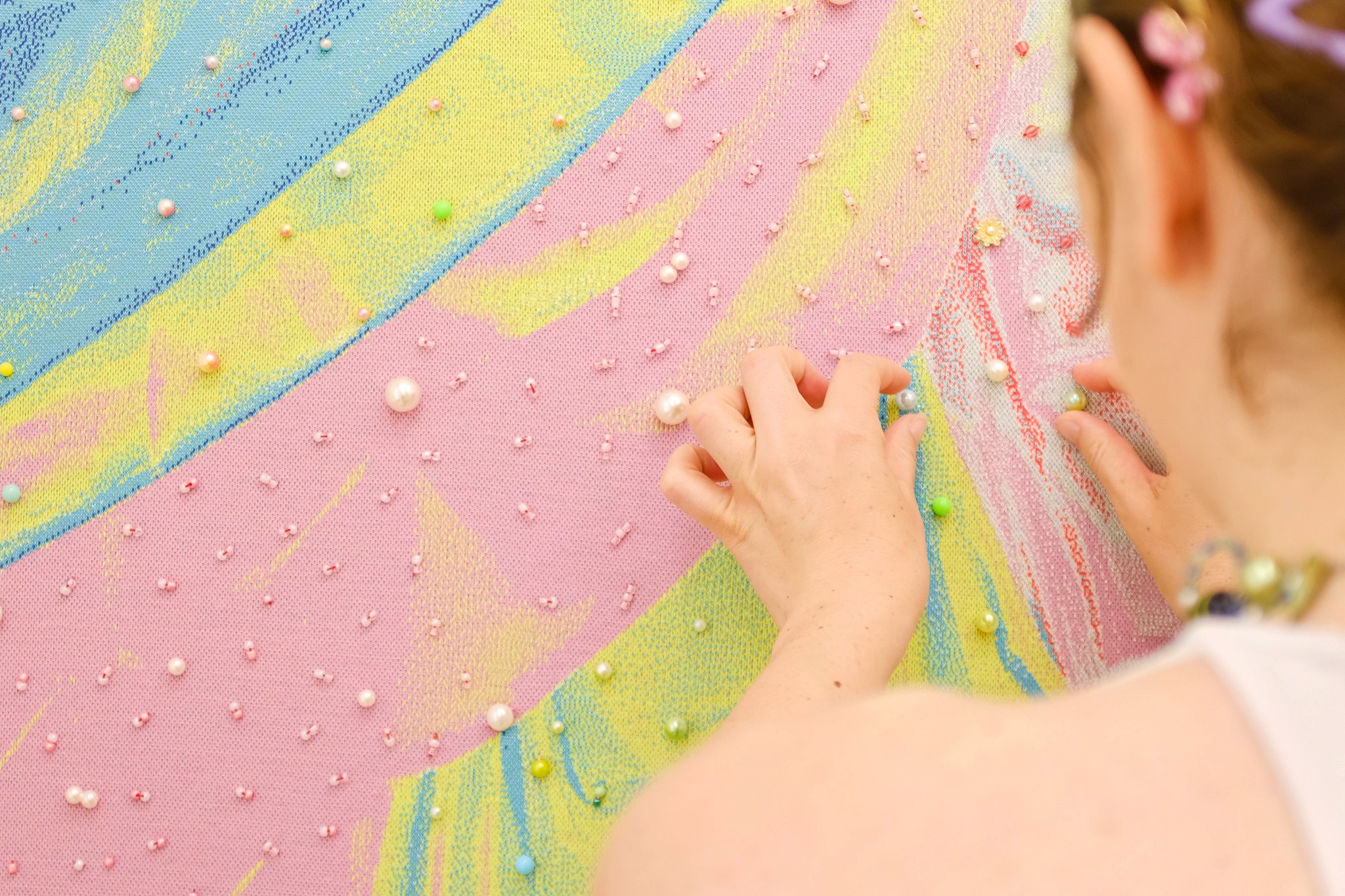 Achter ieder doek schuilt zo een wekenlang proces: het ontwerpen van de set, het maken van de foto’s, het programmeren van de bestanden, het breien van de stof in het Textielmuseum, urenlang handmatig borduren met kralen en uiteindelijk het opspannen op een frame.