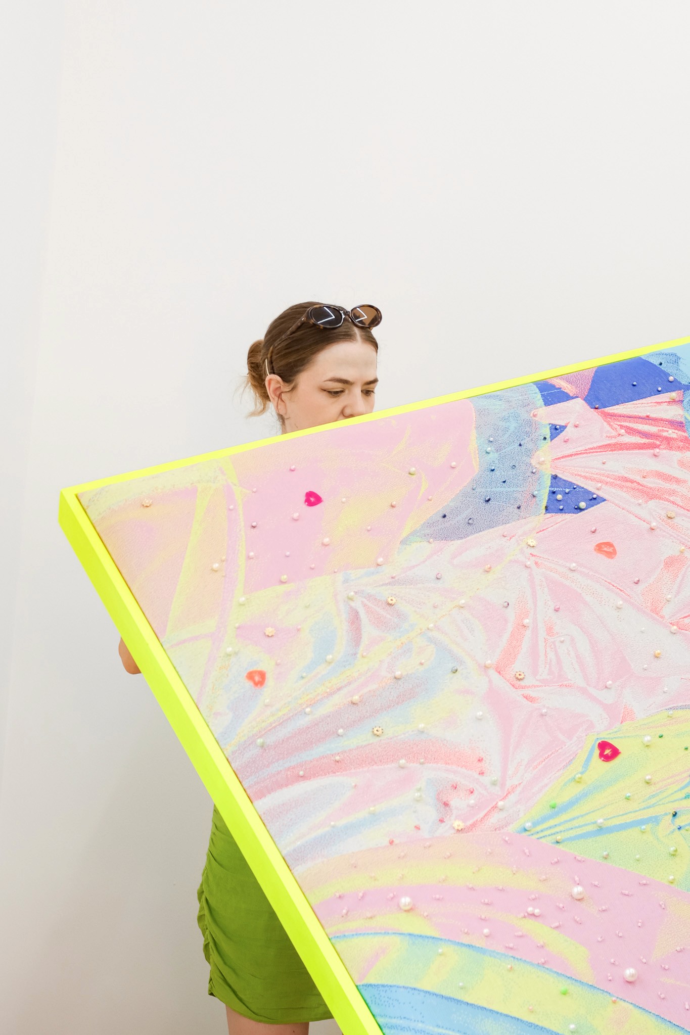 De kamer voelt glamoureus aan. Heldere kleuren en parelmoerachtige details glinsteren door de werken heen. Tegelijkertijd is de ruimte vol zorg, intimiteit en radicale vreugde. Het is zowel filmisch als diep gemeenschappelijk.