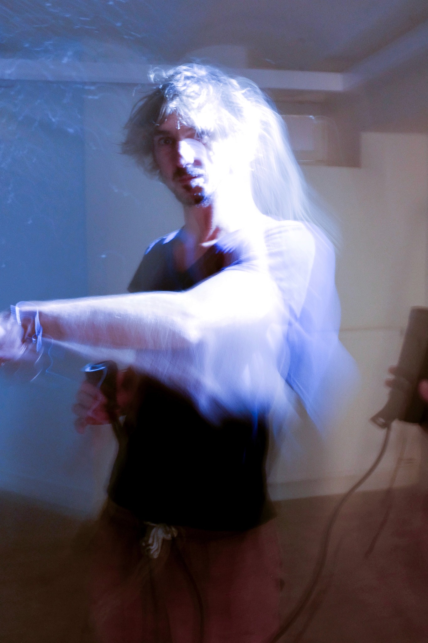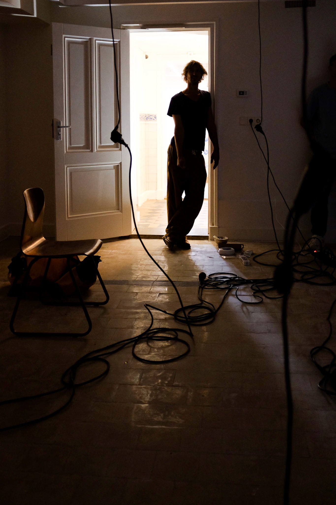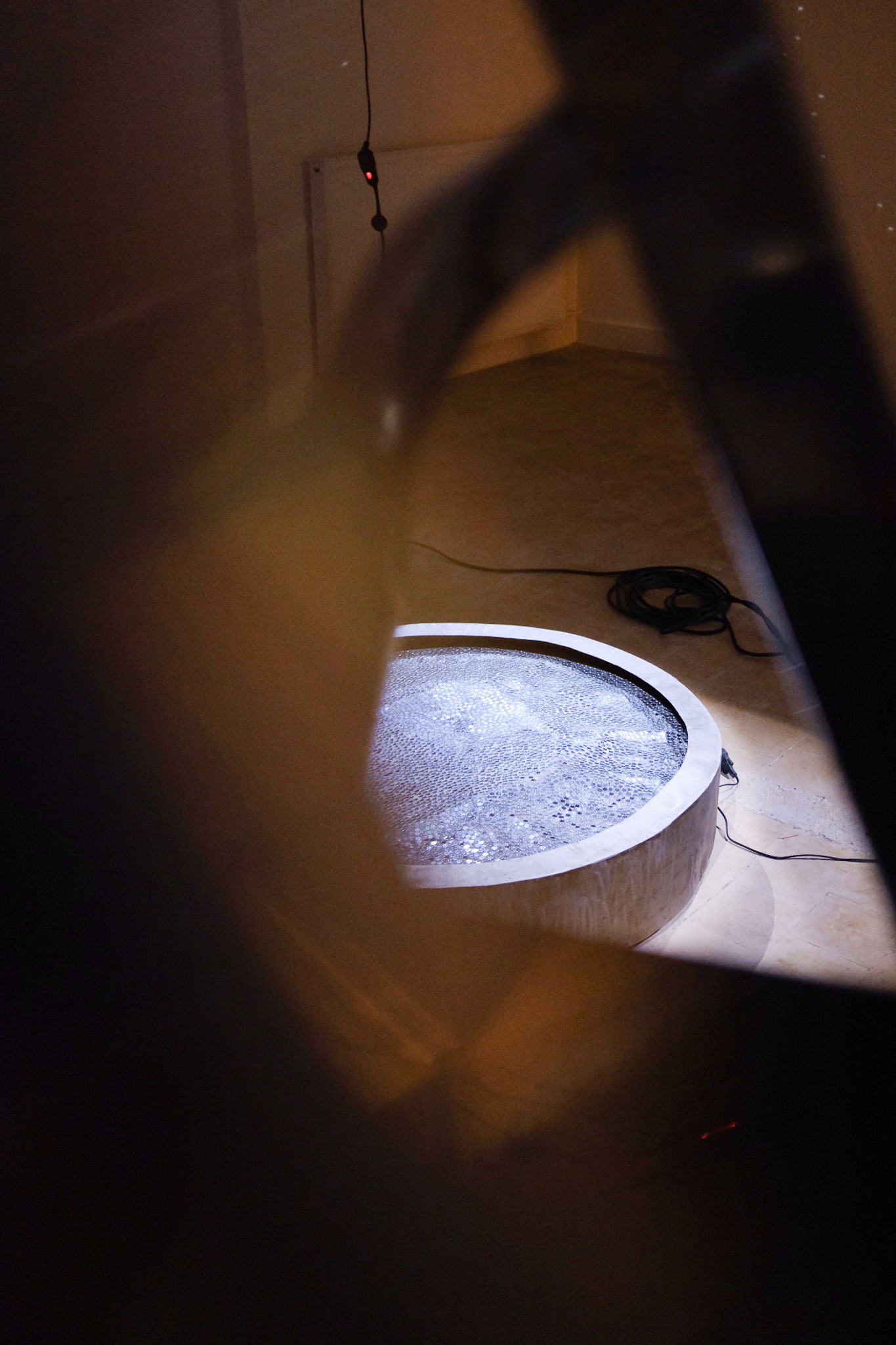 Phosphenes (2019) vormt een betoverende lichtinstallatie. De titel verwijst naar het fenomeen van het flikkeren dat je ziet als je je ogen dichtknijpt. Zoro Feigl brengt deze sensatie naar de ruimte. Een bescheiden bassin, dat doet denken aan een bron, staat centraal in de ruimte. Toch wordt je blik naar boven getrokken, waar licht als vuurvliegjes langs het plafond danst. Op het eerste gezicht lijkt het complex, maar het mechanisme is simpel. Spotlights schijnen op bewegende spiegels, als een verschuivende discobal. De door de kunstenaar ontworpen materialen draaien, tollen, wervelen en vormen patronen die voortdurend veranderen.